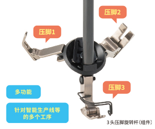 是無需更換3種或2種壓腳即可使用的壓腳桿。旋轉(zhuǎn)所需的壓腳即可使用。