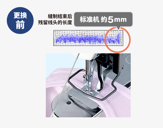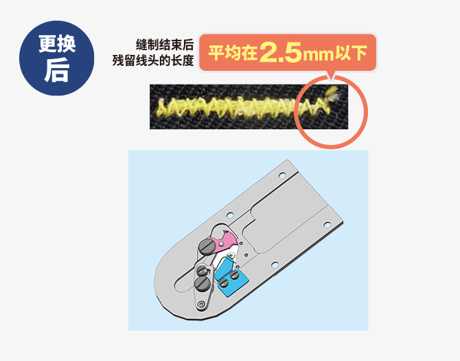 僅通過更換專用針板組件,即可在使用的縫紉機(jī)上增添殘留短線頭的功能??p制結(jié)束后布料背面的殘留線頭平均長(zhǎng)度能達(dá)到2.5mm以下??梢允∪ゼ艟€頭的時(shí)間,對(duì)內(nèi)衣等套結(jié)部分的肌膚觸感會(huì)更好。