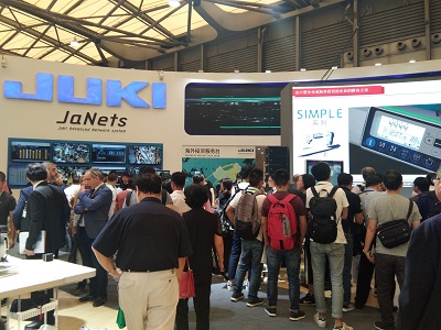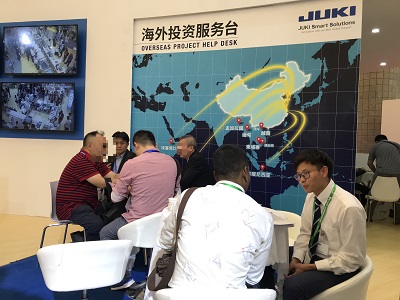 JUKI是以智能工廠的解決方案「支持用自動化和機器人化縫紉機來作業(yè)」、「對數(shù)碼縫紉機進行縫紉數(shù)值管理」、「用JaNets使工廠全體網(wǎng)絡化」為主、展示了工業(yè)用縫紉機78臺、家庭用縫紉機20臺,吸引了很多客人到場。另外,為了考慮進軍海外的客戶設置「進軍海外投資咨詢角」、對JUKI的全球化展開進行說明,讓很多客戶來跟JUKI商談的話,之前和之後也可以安心了。理解到可以做到這樣地步的,只有JUKI。