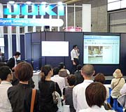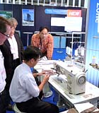 在新商品展位內(nèi),使用了大型的顯示器,除了以演示的形式進(jìn)行說明以外, 還設(shè)置有ISS(智能化縫制系統(tǒng))進(jìn)行公開演示的縫制流水線,可交替進(jìn)行縫制研究所日?;顒拥囊徊糠帧缚p制現(xiàn)場的可視化」、以及小工具、縫制技術(shù)服務(wù)活動(營業(yè)技術(shù)室)等的演示活動。