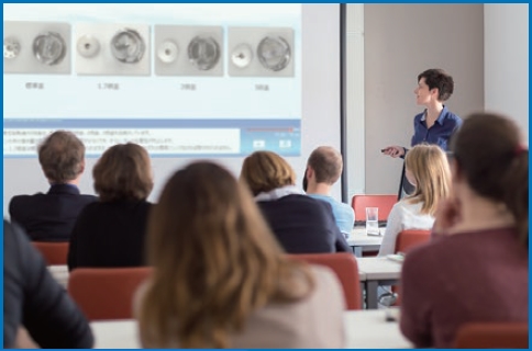這是使用教材的授課方式。在公司內準備好主持人(講師角色)、可一次召集很多人進行授課。為了讓公司內的講師更容易講課、我們準備了各種資料。