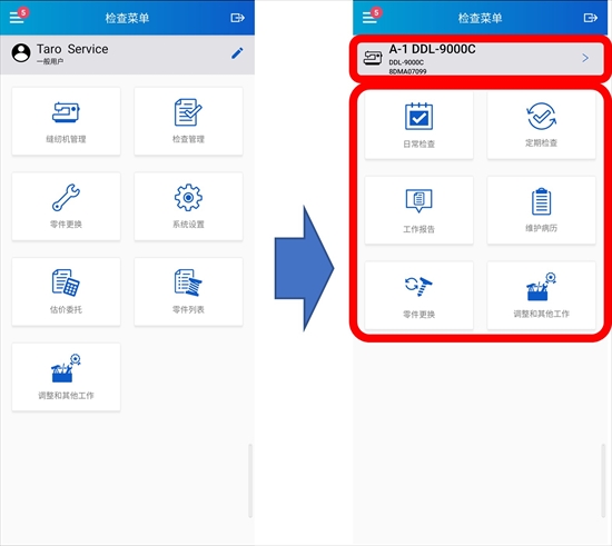 ① 使用頻率高的功能方便訪問,「日常檢查」「定期檢查」等放在了TOP畫面上。先選擇縫紉機(jī)機(jī)種,在不進(jìn)行選擇其它另外機(jī)種的情況下,可以對已選擇機(jī)種進(jìn)行各種訪問和使用。