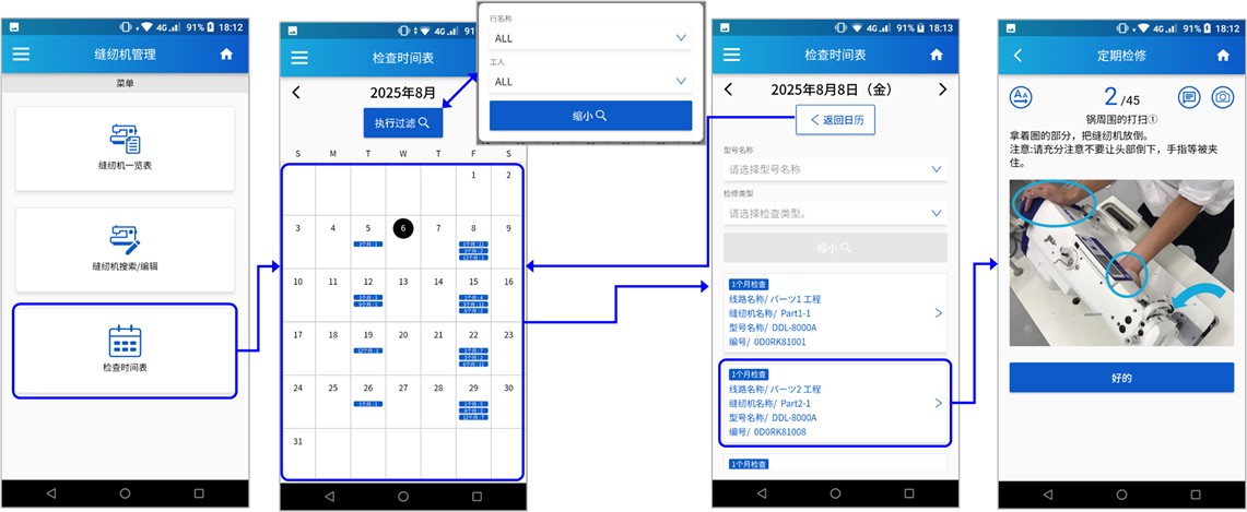 在日歷界面中,可以顯示待檢修縫紉機(jī)的列表,并選擇特定縫紉機(jī)進(jìn)行檢修。