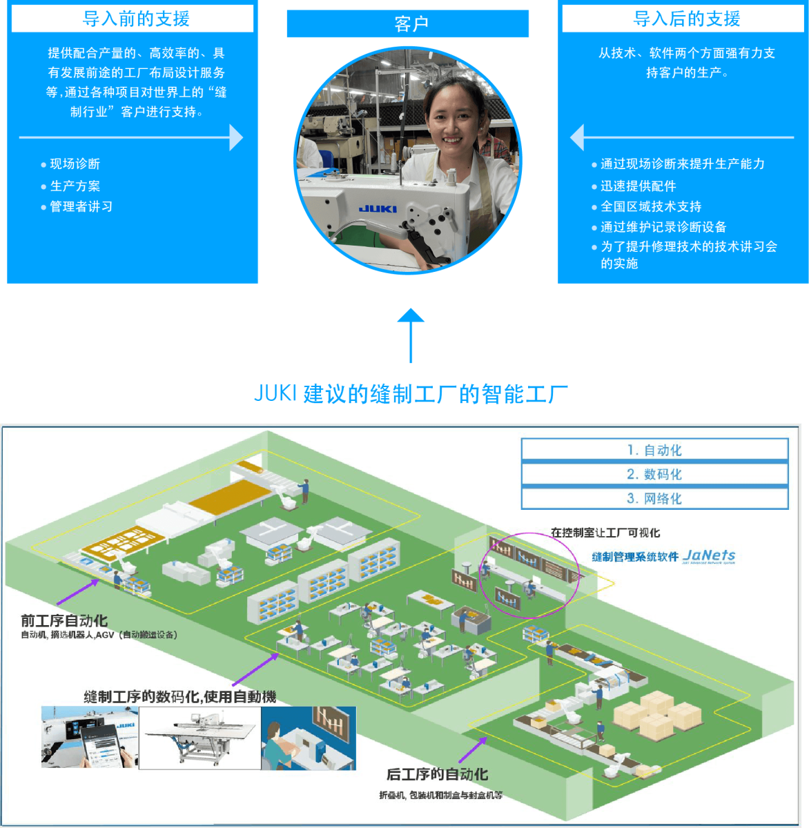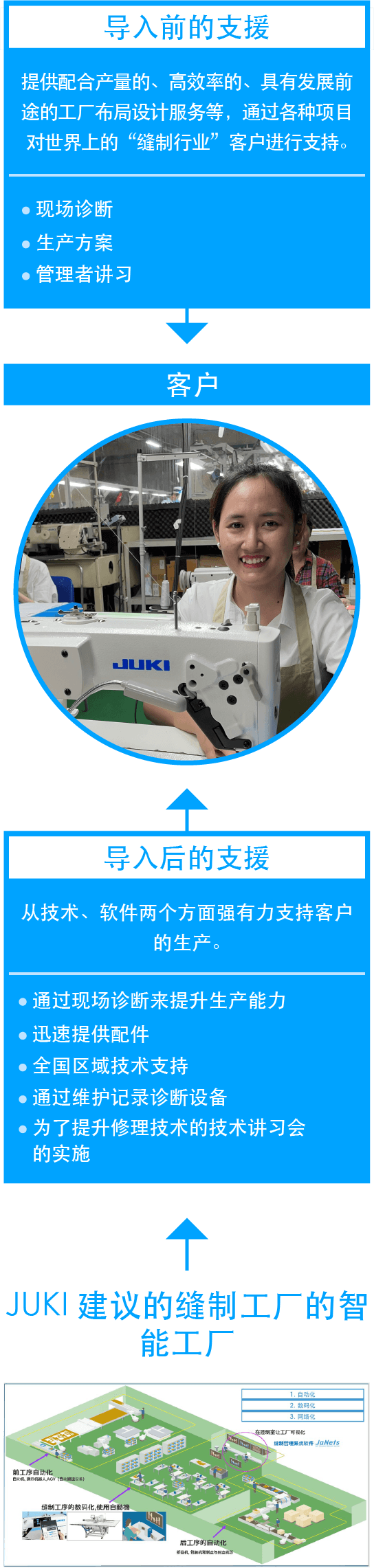 工業(yè)用縫紉機(jī)在中國(guó)國(guó)內(nèi)有10處銷售·服務(wù)據(jù)點(diǎn),從技術(shù)研討,到各種講習(xí)活動(dòng),通過解決課題的技術(shù)提供,JUKI設(shè)備與系統(tǒng)軟件的利用來幫助實(shí)現(xiàn)客戶現(xiàn)場(chǎng)智能化。