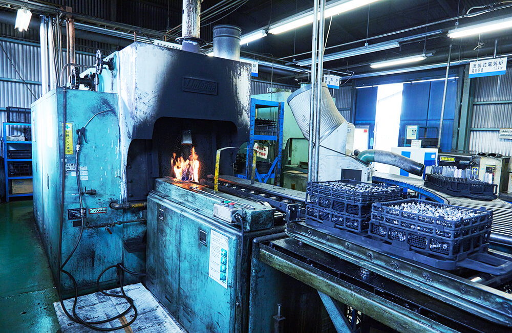 使低碳素鋼表面滲入碳素,提高碳素濃度后再進行淬火的加工方法。表面硬、耐摩性出色,內部柔軟、韌性出色??商幚頊囟葹?90℃~910℃。