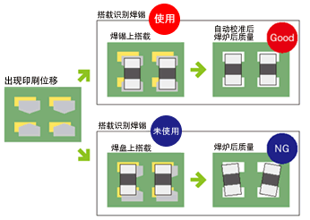 基板的伸縮等原因會導致焊錫印刷位移,特別是本身較輕的小型芯片元件的場合,采用貼裝識別焊錫功能能進行自動校準,能有效降低由印刷位移造成的影響。