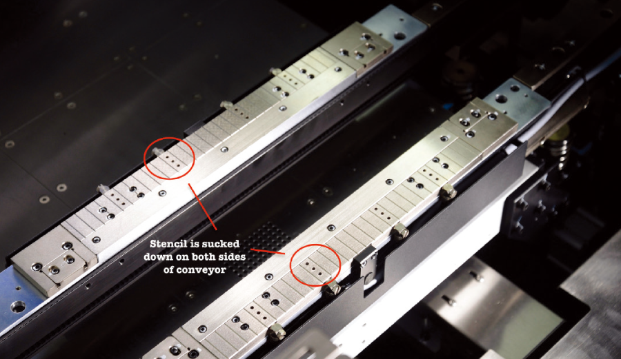 鋼網(wǎng)鎖定在印刷周期中通過輸送機兩側的吸附部牢固固定住鋼網(wǎng),