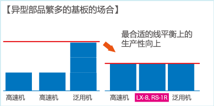 無需交換貼片頭、無需交換設(shè)備、即可實(shí)現(xiàn)最合適的線平衡及最高的生產(chǎn)產(chǎn)出。RS-1R導(dǎo)入后、芯片部品繁多生產(chǎn)時(shí)可以減少高速機(jī)的負(fù)荷、異型部品繁多的生產(chǎn)時(shí)可以減少泛用機(jī)的負(fù)荷。現(xiàn)有設(shè)備和RS-1R組合的生產(chǎn)線自不用說,能對(duì)應(yīng)廣泛部品的RS-1R多臺(tái)連接,也能構(gòu)筑高產(chǎn)出的生產(chǎn)線。
