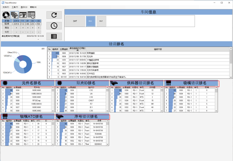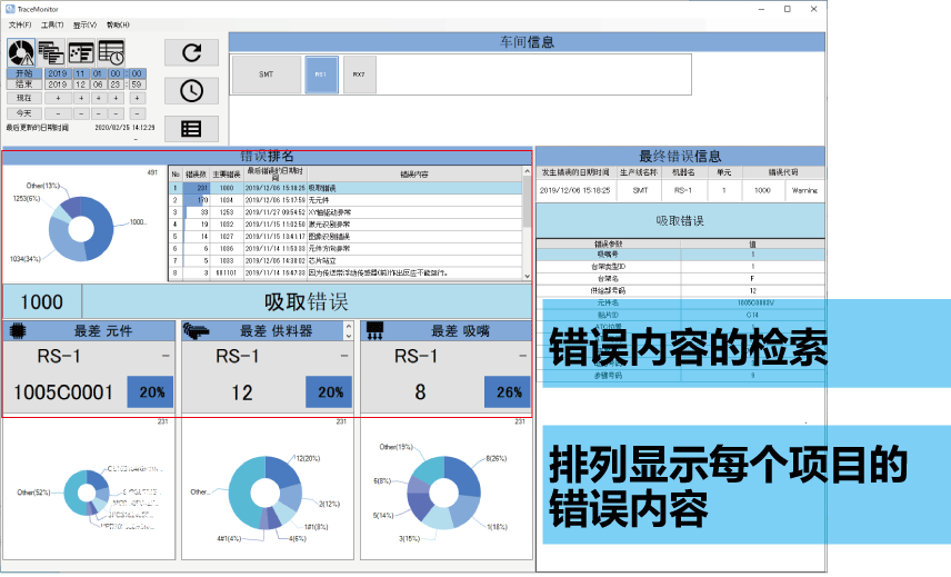 除了錯誤排列畫面,還顯示貼裝ID、吸嘴ATC、序列號等、及更詳細的錯誤內(nèi)容。通過分析哪個組合的錯誤較多,可進一步限定改善項目。