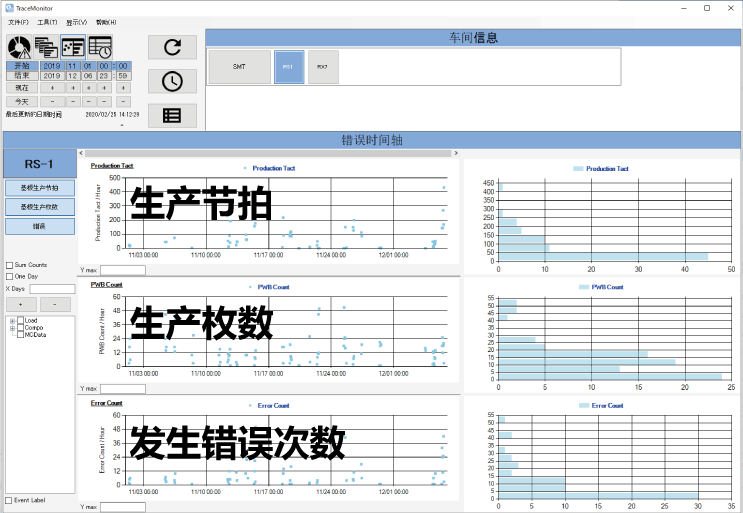 一目了然地顯示了什么時候、什么時機、發(fā)生了什么樣的變化。以時間順序顯示生產(chǎn)節(jié)拍、生產(chǎn)枚數(shù)、錯誤發(fā)生次數(shù)。這樣以就能夠以時間順序分析關(guān)系性,限定變化點。